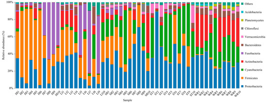 Total bacterial in samples were classified into 42 phyla and 486 genera. The dominant bacterial phyla (top 10) of intestines, water, and sediments were Proteobacteria, Firmicutes, Cyanobacteria, Actinobacteria, Fusobacteria, Bacteroidetes, Verrucomicrobia, Chloroflexi, Planctomycetes, and Acidobacteria (Figure 5). Although the taxonomic composition of the microbial communities was similar among the five groups, the relative abundance of bacterial phyla was different. Proteobacteria was the most abundant phylum in MI, ST, and WR, and the second most abundant phylum in HI and LI. Firmicutes was the most abundance abundant phylum in HI and LI, accounting for 48.29% and 35.17%, respectively. Cyanobacteria was the second most abundant phylum in ST and WR, accounting for 37.29% and 29.43%, respectively. The abundances of Actinobacteria was higher in WR than other groups. The abundances of Chloroflexi was higher in ST than other groups. Fusobacteria showed high abundance in some samples of group HI and LI. The abundance of Planctomycetes in habitat samples (ST and WR) were clearly higher than intestinal samples (HI, LI and MI).