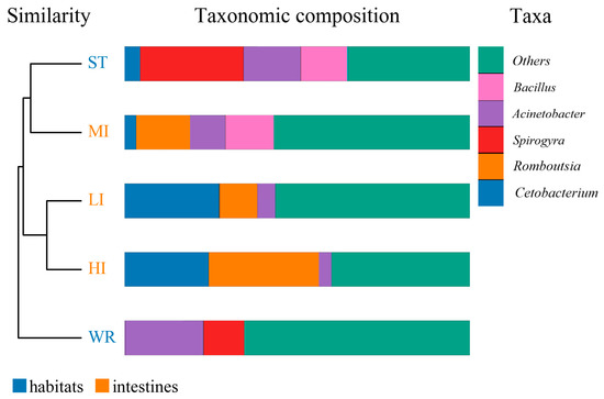 The alpha-diversity indices (Shannon, Gini-Simpson, Chao-1, and ACE) were calculated at the level of OTUs and results were showed in Table 1. The coverage was always maintained at 0.99 (Table 1). Shannon index and Gini–Simpson index are used to measure the bacterial diversity. The larger Shannon index and Simpson index indicated the higher bacterial diversity of the samples. Chao1 and ACE indexes are used to measure bacterial richness. The larger Chao1 and ACE indexes indicated the higher the bacterial richness of the samples. Results indicated that the WR samples showed the highest microbial diversity with the Shannon and Gini-Simpson index (Table 1). Furthermore, the microbial richness in the habitats samples (ST, WR) was significantly higher than in the intestines samples (LI, HI, MI) with the Chao1 and ACE indexes, the intestine microbial diversity of MI was higher than both LI and HI (Table 1).