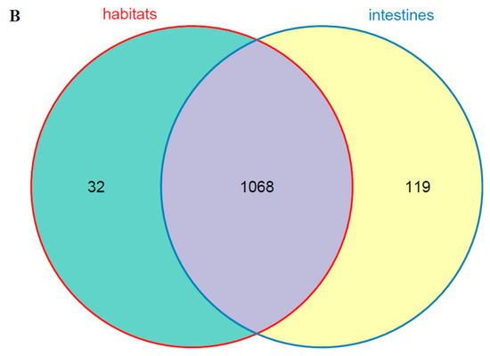Since aquatic animals are continuously exposed to water, the structure and composition of their mucosal microbiota are strongly affected by the habitats [42]. Previous studies had demonstrated that the intestinal microbial composition of fishes, shrimps, and crabs were affected by the surrounding environment (e.g., water or sediments) [43,44,45] or feeding strategy [46,47]. However, most of these studies were carried out by changing the feed composition and geographical location, or through environmental stress. Indeed, few researchers have constructed complex systems based on artificial fishery habitats to study the impact on the omnivorous fish intestines. Therefore, host-associated microbiota that is influenced by habitats remains relatively unclear. We hypothesized that the bacterial communities of water and sediments would have a substantially higher microbiota diversity compared to the omnivorous fish intestines due to the complex systems of artificial fishery habitats.