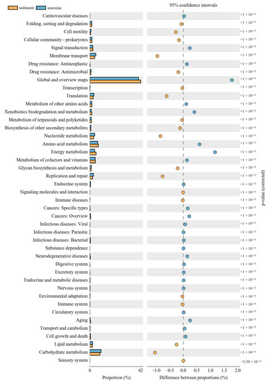 Function differences of the microbial community between sediments and intestines. Significantly different results (p < 0.05) among KEGG pathway categories are shown.