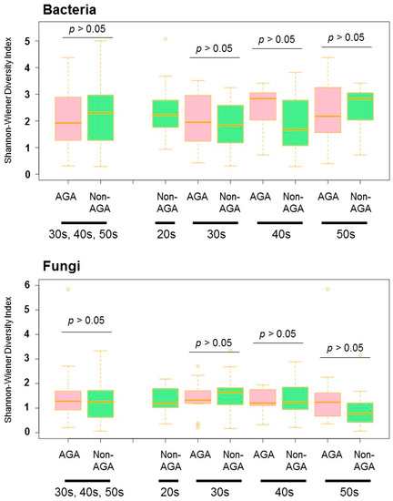 Suzuki, K.; Inoue, M.; Cho, O.; Mizutani, R.; Shimizu, Y.; Nagahama, T.; Sugita, T. Scalp Microbiome and Sebum Composition in Japanese Male Individuals with and without Androgenetic Alopecia. Microorganisms 2021, 9, 2132. https://doi.org/10.3390/microorganisms9102132