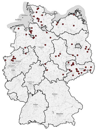 To illustrate the location of farms that participated in the study, a map was created using Kartenexplorer Version 2.04 (R6) (http://kartenexplorer.fli.de/ (accessed on 20 February 2021)). The farms were mainly located in the north and east of Germany (Figure 1).
