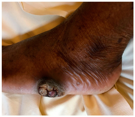 A 52-year-old Congolese woman presented to our hospital with a painful lesion located on the external side of the left foot that had been evolving for two months. The unique abscess-like lesion measured 2 cm in diameter and produced a chronic sero-hematic discharge.