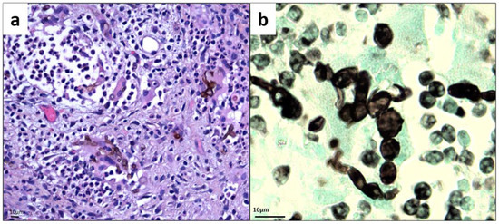 Melanized saprophytic fungi are distributed worldwide, especially in extreme conditions, including in decaying wood or leaves and soil. Although the pathogenicity of such dematiaceous fungi is generally considered to be limited, they probably possess the properties required for virulence towards plant or human tissues and low susceptibility to antifungals [12]. There are very scarce data on the antifungal susceptibility of Kirschsteiniotheliales due to their rare involvement in human infections, as well as technical issues related to their slow growth in vitro. A Kirschsteiniothelia spp. isolate was tested by Nishi et al. and showed a high minimal inhibitory concentration (MIC) against most of the usual antifungals, such as triazoles (>8 µg/mL for itraconazole and voriconazole), amphotericin B (>16 µg/mL), and echinocandins (0.5 µg/mL and 4 µg/mL, for micafungin and caspofungin, respectively) [7]. By contrast, the MIC against 5-fluorocytosin, which can be combined with azoles, was low (0.12 µg/mL). In any case, such low overall antifungal susceptibility supports the need to include physical treatment in the management of chromoblastomycosis, e.g., thermotherapy or phototherapy, when early surgical excision of the initial lesion is not performed [13].