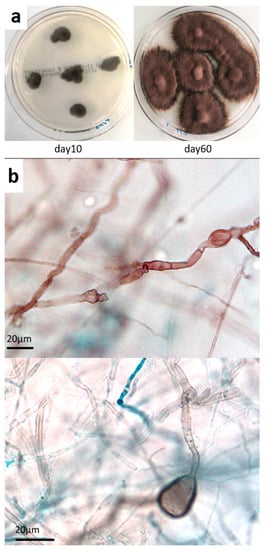 Mycological culture of skin biopsy. (a) Colonies obtained on Sabouraud chloramphenicol plates after incubation at 27 °C for 10 and 60 days. (b) Microscopic appearance of fungal colonies, showing dark sterile hyphae with swellings and cell-wall ornamentations (magnification ×500, ×1000, respectively).