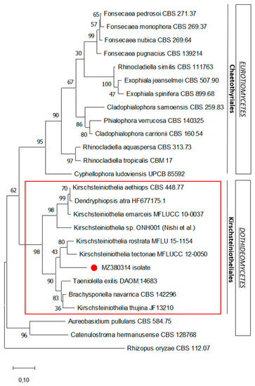 Molecular sequencing of the ITS1-5.8S-ITS2 and 28S (LSU) regions of the ribosomal DNA was performed and the nucleotide sequences deposited in Genbank (ITS: MZ380314 and LSU: MZ380317). Comparison with fungal species from the Genbank database showed a high percentage of identity matches with the Dothideomycetes class, especially with Kirschsteiniotheliales, such as Kirschsteiniothelia spp. (88–95%), Taeniolella exilis (94.6%), and Dendryphiopsis spp. (89.13–89.48%). A phylogenetic analysis of the ITS1-5.8S-ITS2 rDNA sequence was performed (Figure 4), showing that the sequenced isolate was a member of Kirschsteiniotheliales (Dothideomycetes) and unrelated to the Chaetotyriales taxon (Eurotiomycetes), of which most species commonly responsible for chromoblastomycosis belong. However, no reliable species identification could be attributed, probably because this fungus has never been described.