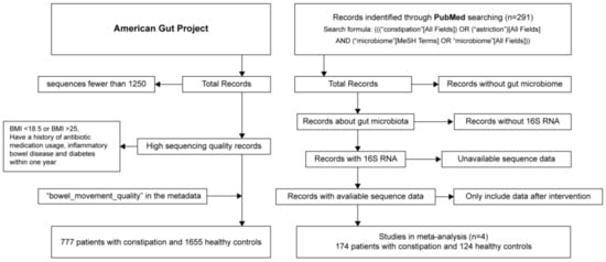 Most of our raw data came from the AGP [] and were downloaded from its website. Samples with fewer than 1250 sequences were excluded. The samples with a BMI between 18.5 and 25, no history of antibiotic medication usage, inflammatory bowel disease, and diabetes within one year were defined as healthy samples, and the index named “bowel_movement_quality” in the metadata table of the AGP was used to determine constipation samples. A total of 777 constipation samples and 2138 healthy samples from the AGP were included in this study. In addition to the AGP data, data from some other studies that met the following inclusion criteria were included to expand the scale of the data: (1) the study focused on constipation and the gut microbiome, and (2) the study evaluated 16S rRNA sequence data, and the raw data could be downloaded from a public database. Based on Pubmed and the search formula (((“constipation”[All Fields]) OR (“astriction”)[All Fields] AND (“microbiome”[MeSH Terms] OR “microbiome”[All Fields])), the sequence data of four extra studies were included in this study with the SRA numbers ERP012611, SRP109879, SRP116968, and SRP169528 [,,,].