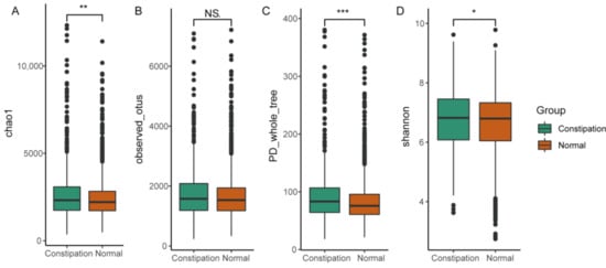 All gut microbiome diversity indices, except the observed operational taxonomic units, increased in patients with constipation (A–D). Statistical significance between groups is indicated by NS, *, **, ***, corresponding to p > 0.05, <0.05, <0.01 and <0.001 respectively.