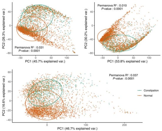 To explore the differences in α-diversity between healthy and constipation samples, the Wilcoxon rank-sum test was performed using the “wilcox.test()” function in the basic package of R-3.4.4, with the p-value adjusted based on the FDR using the “p.adjust()” function in the basic package of R. For β-diversity, permutational multivariate analysis of variance (Permanova) and a PCA based on weighted Unifrac, unweighted Unifrac, and Bray–Curtis distance matrices were performed using the “adonis()” and “prcomp()” function of the vegan and psych package, respectively [,]. The result was plotted using the ggbiplot package in R-3.4.4. The unweighted and weighted Unifrac distance matrices were calculated using the QIIME pipeline, and the Bray–Curtis distance matrix was calculated based on the genus-level OTU table using the “vegdist()” function of the vegan package in R [].