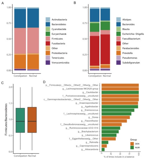 Differences in the gut microbiome composition at the phylum level (A) and genus level (B) between patients with constipation and healthy controls. The Firmicutes:Bacteroidetes ratio of the gut microbiome did not differ significantly between the two groups (C). The balance selected genera that significantly differed between the two groups (D).