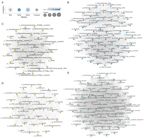 The number of genera and Kendall correlation of clustered modules (A). The network modules significantly related to constipation and highly interaction genera were indicated. The cluster of Blue (B), Yellow (C), Brown (D) and Turquoise (E).
