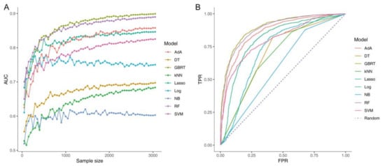 To explore whether the scale of datasets would affect the performance of classifier models, all of the machine-learning models were trained on 50 subsets by stratified random sampling, with the size of each subset increasing at the same ratio. The performance of each model was evaluated by the receiver operating characteristic curve, which was relatively low and unstable when the sample size was less than 1000 (Figure 6). The performance and sample-size curve tended to plateau with an increase in sample size, which suggested that the data scale used in this study was sufficient to produce a reliable result.