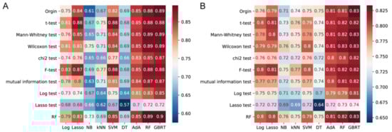 To improve the predictive performance and provide cost-effective predictions, nine feature selection methods, namely the t-test, Wilcoxon test, Mann-Whitney test, chi2 test, F-test, mutual information test, Log test, Lasso test, and RF were performed to select important OTUs from high-dimensional feature space to classify. The subsets of features obtained by different methods exhibit certain similar distribution patterns, which contain overlapping common colony structures (Supplemental Figure S1, Table S1). Subsequently, different feature selection methods and machine learning algorithms combinations were examined for their AUC value and predictive accuracy (Figure 7A,B). Most feature selection methods can be implemented to varying degrees while reducing feature dimensions without affecting performance, especially for tree-based models. Among all of the classifiers, the RF-GBRT model had the highest AUC value (90.0%; Figure 7A).