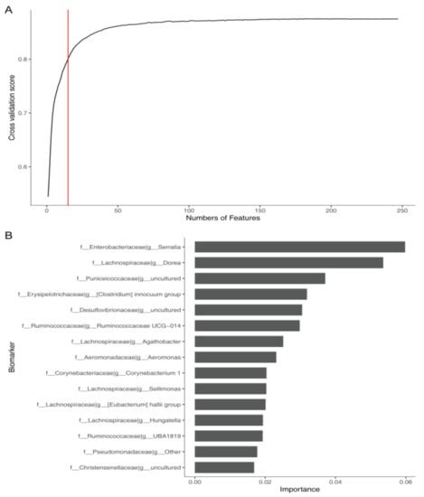 Relationship between the numbers of features and cross-validation scores (A). The top 15 genera were selected as the potential biomarkers of constipation (B).