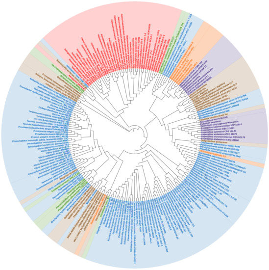 The tnaA sequences (>1200 nts) of 221 isolates of 36 eukaryotes (Drosophila, hemichordates and marine organisms including octopus, sea anemone, corals, hermit crab), 41 archaea, 16 fungi, and 128 prokaryotes (Gram-positive and -negative bacteria) were investigated in the present study. These gene sequences were obtained from the NCBI database (https://www.ncbi.nlm.nih.gov/gene accessed on 8 October 2020). The following exclusion terms were used: putative protein; TnaA leader peptide (tnaC); tryptophan 2,3-dioxygenase; and hypothetical proteins; record removed; and large eukaryote sequences (with long ‘N’ stretches). Curation of tnaA sequences was performed manually to avoid redundant/partial or non-related sequences.
