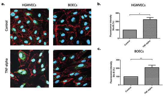 HGMVECs and BOECs were seeded in a black 96-well plate with a clear bottom (Falcon Corning Incorporated, Corning, NY, USA). Cells were incubated with either control medium or medium with 10 ng/mL of TNFα (Roche Diagnostics GmbH, Mannheim, Germany) for 24 h and fixed with 2% paraformaldehyde (PFA)/PBS (Sigma Aldrich) at room temperature for 15 min. Mouse anti-CD31 (BD Biosciences, San Jose, CA, USA) primary and corresponding species-specific Alexa Fluor 568 were used as antibodies. Alexa 488-labeled Stx-B at a concentration of 5 μg/mL and the fluorescent DNA stain DAPI (Invitrogen, Carlsbad, CA, USA) were added, and images were taken with the use of a Zeiss LSM900 confocal microscope (Zeiss, Oberkochen, Baden-Württemberg, Germany).