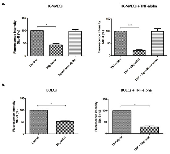 Primary HGMVECs from four healthy donors were incubated with or without 10 ng/mL TNFα, 8.0 nM of Eliglustat, or 10 μg/mL of Agalsidase alpha for 24 h. The concentrations and incubation times used for these experiments were determined by flow cytometry titration curves (data not shown) or established before [34]. Agalsidase alpha had no significant effect on Stx-B binding to the cellular surface, while the binding decreased by 56% in cells incubated with Eliglustat in comparison to the control group (Figure 3a). An even stronger effect was obtained when primary HGMVECs were incubated with TNFα in combination with Eliglustat. TNFα in combination with Eliglustat for 24 h resulted in a decrease of Stx-B binding by 79% as compared to the control group treated with TNFα solely (Figure 3a).