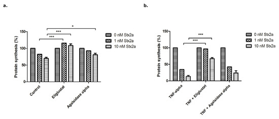 More importantly, when 10 ng/mL of TNFα at the same time as Eliglustat or Agalsidase alpha was added, Eliglustat still significantly counteracted the decreased protein synthesis caused by Stx2a (Figure 4b). Stx2a application of 1.0 nM for 24 h hardly caused any inhibition (estimated 3%) in the TNFα + Eliglustat group vs. 65% when TNFα alone was used (Figure 4b). For 10 nM Stx2a, this was 33% vs. 87%, respectively. Agalsidase alpha had no significant effect on protein synthesis caused by Stx2a when used in combination with TNFα (Figure 4b).