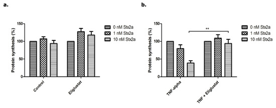 Protein synthesis of BOECs incubated with Stx2a for 24 h. (a) Protein synthesis of BOECs pre-incubated with 8.0 nM Eliglustat for 24 h. After 24 h, cells were incubated with Stx2a for 24 h. (b) Protein synthesis of BOECs pre-incubated with 10 ng/mL of TNFα or TNFα in combination with Eliglustat at the same time for 24 h. After 24 h, cells were incubated with Stx2a for 24 h. Statistical significant differences are indicated with double characters (p-value < 0.01).