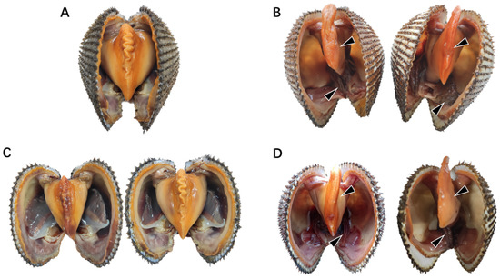 Symptoms of natural diseased ark clams. (A) Healthy ark clams. (B) Natural diseased ark clams. (C) Ark clams in the control group without SbA1-1 challenge at low (15 °C, left) and high (25 °C, right) temperatures. (D) Ark clams challenged with SbA1-1 strain (1 × 105 CFU/mL) under 15 °C (left) and 25 °C (right). The black arrow marks the site of the lesion.