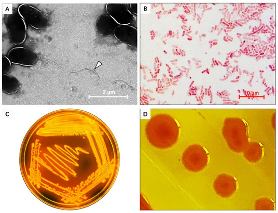Morphological characteristics of V. kanaloae strain SbA1-1. (A) The morphological structure of SbA1-1, white arrow indicates the flagellum. SbA1-1 grew in liquid, was negatively stained with 2% phosphotungstic acid, and examined under TEM. Magnification, ×5000. (B) The characteristics of SbA1-1 after Gram staining. SbA1-1 shows red staining with a curved rod shape. (C,D) Colonial morphology and color of SbA1-1 on Thiosulfate Citrate bile salts sucrose (TCBS) agar.