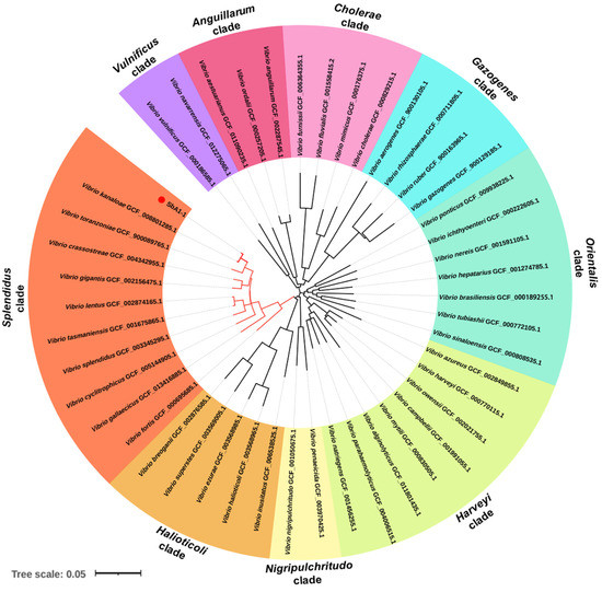 Phylogenetic tree of bacteria (V. kanaloae strain SbA1-1) based on concatenated sequences of atpA, mreB, pyrH, recA and rpoA genes (4958 nt) using the NJ method and visualized in iTOL v6.1.1. (https://itol.embl.de/, accessed on 26 March 2021). The colored sectors indicate distinct Vibrio clades. The scale bar corresponds to 0.05 substitutions per site.
