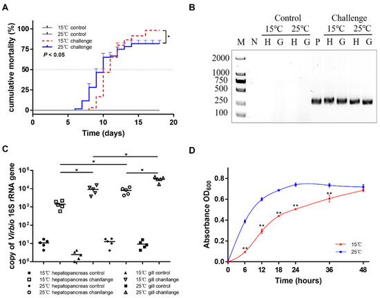Pathogenicity of SbA1-1 to ark clams. (A) Cumulative mortality of ark clams challenged with SbA1-1. Ark clams in the challenge group were immersed in SbA1-1 (1 × 105 CFU/mL) at 15 °C and 25 °C. * p < 0.05. (B) Detection of challenged ark clams by V. kanaloae-specific nested PCR. M: molecular marker; N: negative control; P: positive control; H: hepatopancreas; G: gill. (C) The abundance of Vibrio in hepatopancreas and gill tissue after SbA1-1 infection in ark clams. ** p < 0.01; * p < 0.05. (D) Growth dynamics of SbA1-1. Growth was assayed in DPM medium by measuring OD600 for 48 h at 15 °C and 25 °C. ** p < 0.01; * p < 0.05.