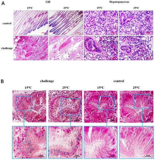 To assess the pathogenicity of the V. kanaloae strain SbA1-1 at different temperature conditions (15 °C and 25 °C), the mortality of ark clams was compared among groups after the challenge. In the challenge groups, the mortality of ark clams at 15 °C was significantly higher (p < 0.05) than at 25 °C, up to 98% on the 16th day after immersion. Additionally, when the ark clam was challenged at 25 °C, 81% mortality was reached after 16 days until the end of the experiment (Figure 5A). Dead ark clams in the 15 °C and 25 °C challenge groups exhibited symptoms that were identical to the natural diseased ark clams: gill erosion, congested gill filaments with broken frontal cells, thin foot, engorged hepatopancreas with extensive necrosis of the digestive epithelium, and a slow response to external stimuli (Figure 1C,D and Figure 6A). Prominent lesions were not observed in the other tissues, including the adductor muscle and mantle (Figure S3). In addition, iron deposition was observed in the submucosa of the hepatopancreatic digestive tube lumen of dead ark clams (Figure 6B). A nested PCR assay specific to V. kanaloae was developed, which did not cross-react with 12 non- V. kanaloae bacteria isolated from shellfish and the genomic DNA of a healthy ark clam (Figure S4). Using a specific nested PCR assay for the tissue-distribution detection of V. kanaloae, V. kanaloae could be detected in the gills and hepatopancreas of 10 randomly selected dead ark clams maintained at each temperature (Figure 5B). Simultaneously, the total Vibrio load in the gills and hepatopancreas of dead ark clams was significantly increased. Vibrio numbers were lower in the hepatopancreas than in the gills and were significantly higher in both tissues at the high temperature compared to the low temperature (Figure 5C). The above results indicated that SbA1-1, which grew slowly when incubated at 15 °C (Figure 5D), showed an increase in pathogenicity at the same temperature compared to 25 °C.