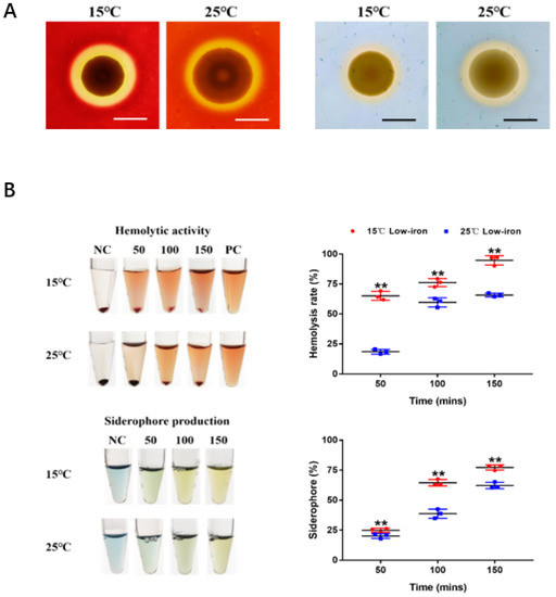 The hemolytic activity and siderophore production of the V. kanaloae strain SbA1-1 were initially observed on blood agar plates and CAS agar plates at 15 °C and 25 °C. SbA1-1 produced a higher translucent hemolysis halo at 15 °C compared to 25 °C, while SbA1-1 formed a larger yellow–orange halo on CAS plates at 25 °C (Figure 7A). The quantification assays indicated that the hemolytic activity and siderophores productivity of SbA1-1 were significantly enhanced at the low growth temperature (p < 0.01) (Figure 7B). When SbA1-1 was incubated at the low temperature (15 °C) after 50, 100 and 150 min, the hemolysis rate increased to 3.47 ± 0.30, 1.28 ± 0.06 and 1.44 ± 0.02-fold, respectively, compared to that at the high temperature (25 °C). Meanwhile, the percentage of siderophores at the low temperature was up-regulated to 1.27 ± 0.11, 1.69 ± 0.01, and 1.22; ± 0.05-fold at 50, 100 and 150 min, respectively.