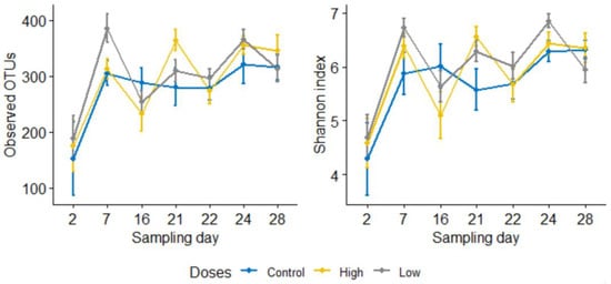 Enrofloxacin altered the richness and evenness of gut microbiota significantly; both metrics were lower at the 24 h post-treatment samples, compared to the 72 h post-treatment samples when the data of the high and the low dose groups were combined. This was expected, since the active concentration of enrofloxacin and ciprofloxacin reaches its maximum concentration in the intestine around 24 h post-inoculation, as reported in a previous study []. When examining the high dose group (pre-treatment versus post-treatment) and the low dose group (pre-treatment versus post-treatment) separately, there was no significant change in microbial richness between pre- and post-treatment samples in either group. However, microbial evenness was significantly altered in the post-treatment samples (Days 22 versus 24, p = 0.008, adj. p = 0.068) of the low dose group but not the high dose group (p > 0.05). Furthermore, microbial diversities between groups measured by the beta-diversity metric (i.e., Bray–Curtis) have indicated a significant difference between pre-and post-treatment microbial community structures, as well as a significant difference between the high dose and the low dose groups.