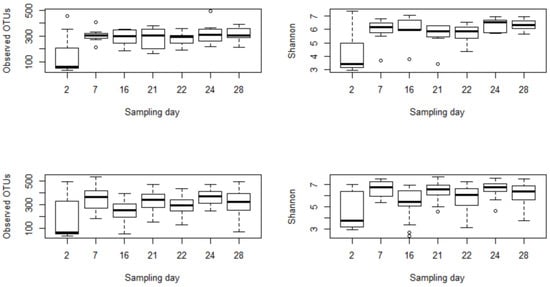 Comparisons of microbial richness (observed OTUs) and evenness (Shannon index) between the control group (top) and the combined treatment group (bottom) by sampling days. The low and high dose groups were collapsed together into a single treatment group to assess the effects of sampling days on microbial diversities. The difference among sampling days was insignificant in control (p > 0.05), but it was significant in the treatment group (p < 0.05). All calves were inoculated with laboratory strains of C. jejuni on day 5; the BRD groups were challenged with M. hemolytica on day 13; and the treatment groups were administered enrofloxacin on day 21.