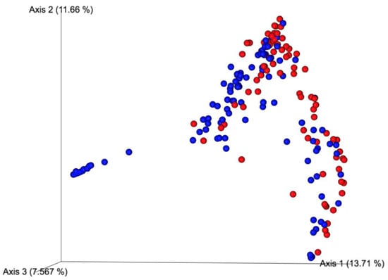 Principal coordinate analysis showing a subtle difference microbial clustering between pre- (blue dots) and post-treatment (red dots) samples in the combined treatment groups.
