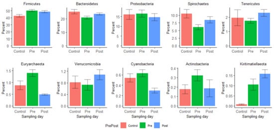 The relative abundance of the ten most frequent phyla was compared between pre- and post-treatment and control samples.