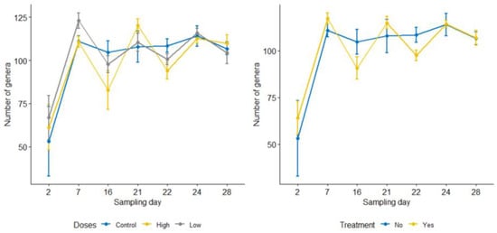 A total of 442 genera were identified in this study; however, 183 of them were found in less than 10% of the samples; thus, they were excluded from statistical analyses. Eighteen of them are members of the core fecal microbiota, existing in ≥90% of the samples [] (Table S1). Comparisons of genus count per sampling day between the treatment and control groups did not significantly differ (Figure 5). This study paid particular attention to the genus Campylobacter due to its public health importance and rising fluoroquinolone resistance among its strains. However, this genus was detected in 53 of the 245 total samples, most of which were the pre-treatment samples (n = 37, only seven in the post-treatment samples). Nine of them were detected in the samples from the control calves. Interestingly, prior to enrofloxacin administration on Day 21, Campylobacter was detected in six calves in the treatment groups; however, 24 h and 72 h after the treatment, only one calf was positive each day. On day 28, however, five calves turned Campylobacter positive (four in the high dose group and one in the low dose group), suggesting the emergence of resistant strains. The relatively lower detection level of Campylobacter in the two post-treatment sampling days than the pre-treatment samples might also suggest that enrofloxacin curtailed the shedding of this organism in the calf feces.
