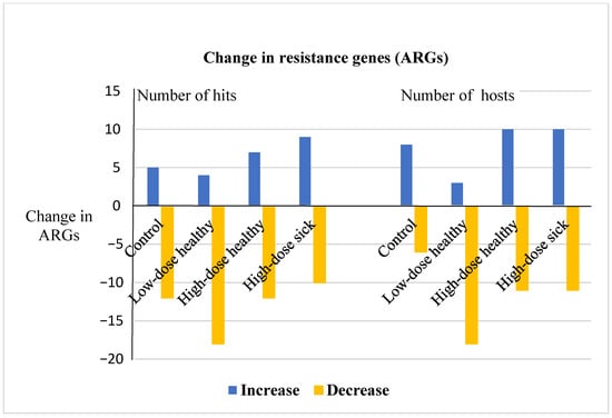 Similarly, the enrofloxacin treatment seemed to affect the number of bacterial hosts identified carrying the resistance markers remarkably. In the treatment groups, the host ranges of 21 ARGs were altered (either decreased or increased after the treatment) compared to 14 ARGs that varied in the control group. Generally, there was no remarkable difference between the two high dose groups. In contrast, it appears that high dose enrofloxacin induces the increased copy number and host ranges of ARGs, whereas the low dose induces a reduction of the number of hits and host ranges of ARGs.