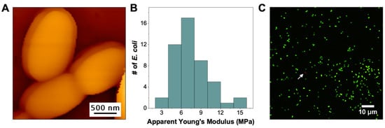 (A) Topography image of E. coli immobilized on the PEI-coated PC membrane. (B) Histogram of the average apparent Young’s Modulus of PC-PEI immobilized E. coli (n = 48). (C) Fluorescence image of PEI-immobilized E. coli stained with SYTO 9 (green) and propidium iodide (red) to test for membrane integrity. White arrow points to a PI-stained bacterium.