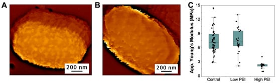 Topography images of E. coli pre-treated with (A) 4 μg/mL (n = 24) and (B) 100 μg/mL (n = 18) unbound PEI. (C) The distribution of the average apparent Young’s modulus of PEI-treated bacteria (low PEI = 4 μg/mL and high PEI = 100 μg/mL unbound PEI) relative to the untreated bacteria (control).