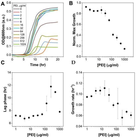(A) Growth curves of E. coli in M9 minimal media after they were pre-treated with increasing concentrations of PEI (60 kDa) for 15 min. Using the Gompertz equation (see Figure S9) to fit the growth curves in (A), the maximal growth (B), lag time (C), and growth rate (D) were obtained as a function of PEI concentration.