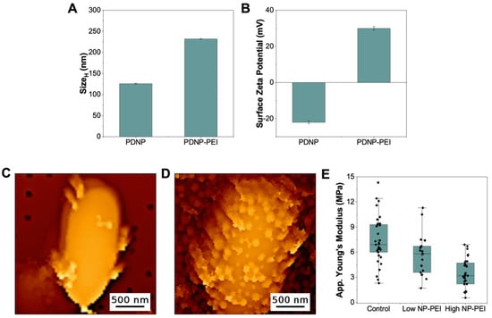 ) and (B) surface zeta potential of polydopamine nanoparticles (PDNP) before and after functionalization with PEI (PDNP-PEI). Topography images of E. coli pre-treated with (C) 4 μg/mL (n = 20) and (D) 100 μg/mL (n = 31) PDNP-PEI. (E) The distribution of the average apparent Young’s modulus of PDNP-PEI treated bacteria (low NP-PEI = 4 μg/mL and high NP-PEI = 100 μg/mL PDNP-PEI) relative to the untreated bacteria (control).