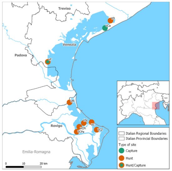 Location of hunting sites (orange color) and capture sites (green color). V, Valle; VCPa, V. Ca Pasta (RO); VCZ, V. Ca Zuliani (RO); VD, V. Drago (VE); VSL, V. San Leonardo (RO); VC, V. Chiusa (RO); VCPi, V. Ca Pisani (RO); VM, V. Morosina (RO); VF, Valle Figheri (VE); VCa, Valle Cavallino.