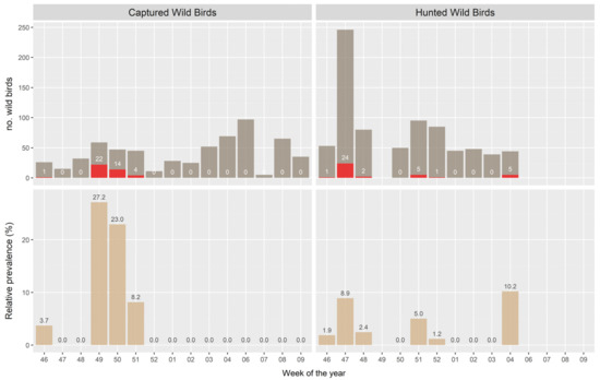 HPAI epidemic curves in captured and hunted wild birds during late autumn–winter seasons 2020–2021 in northeast Italy. Upper panel: number of wild birds tested with RT-PCR; dark grey bars: HPAIV negative birds; red bars: HPAIV positive birds. Lower panel: HPAI relative prevalence.