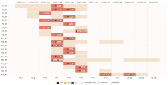 On 11 December 2020 (VF-5), HPAI H5 viruses were mainly found in OS of juvenile female ETs, in one bird a coinfection of HPAI H5N1 and H5N8 was detected (Table 4: C30_ET). HPAIV were identified in VF until 18 December 2020 (VF-6).