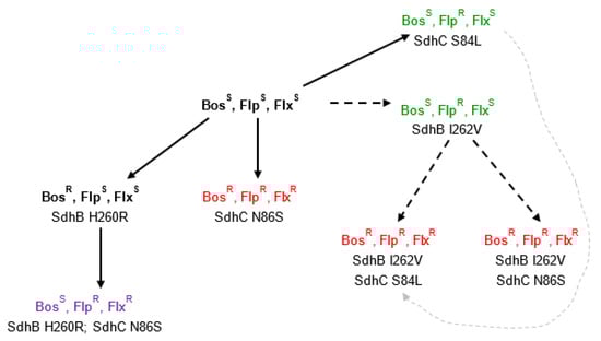 - Veloukas, T.; Markoglou, A.N.; Karaoglandis, G.S. Differential effect of SdhB gene mutations on the sensitivity to SDHI fungicides in Botrytis cinerea. Plant Dis. 2013, 97, 118–122. [Google Scholar] [CrossRef] [PubMed] [Green Version]