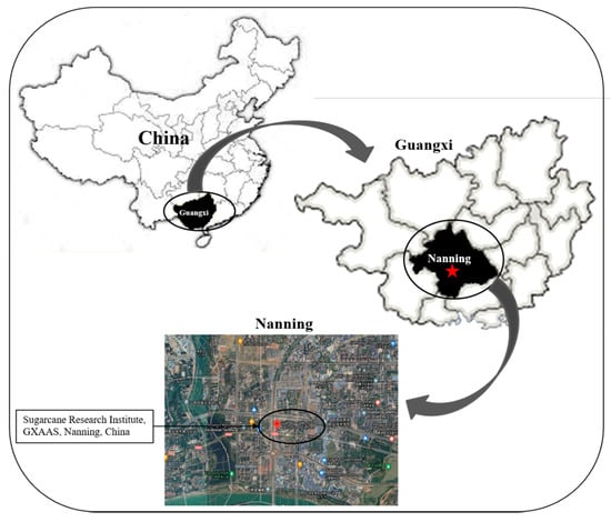 Rhizosphere soil samples from the widely grown sugarcane variety GT44 were collected in the month of June 2020 from the agriculture field of the Sugarcane Research Institute, Guangxi Academy of Agricultural Sciences, Nanning, Guangxi, China (Latitude 22°50′ N; Longitude 108°14′ E) (Figure 1). The study area has a humid subtropical climate with an annual mean temperature of 21.83 °C and a rainfall of 1290 mm. The collected rhizosphere soil was sandy, silty, and clayey in texture with a 7.2 pH and a 3.2 dSm−1 electric conductivity (EC). For the isolation of salt-tolerant rhizobacteria, a dry and sieved composite rhizosphere soil sample was enriched in NaCl (10%)-supplemented nutrient broth (NB) for 5 days at 28 °C. Afterward, a serially diluted (10−3, 10−4, and 10−5) enriched soil sample was spread on nutrient agar (NA) plates supplemented with 10% NaCl and incubated for 48 h at 28 °C. After incubation, a fast-growing bacterial colony (ASN-1) showing dominant growth was picked, purified by sub-culturing on a fresh NA plate, and preserved in 50% glycerol at −80 °C for further use.