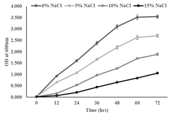 To evaluate the NaCl tolerance efficiency, 1% of fresh, exponentially grown bacterial culture was inoculated in NB supplemented with different concentrations (5, 10, 15, and 20%) of NaCl and incubated in an incubator at 28 °C for 72 h at 150 rpm. The growth of the isolate at various levels of NaCl stress was analyzed by measuring the optical density (OD) in a spectrophotometer (Shimadzu, Kyoto, Japan) at 600 nm at every 12 h time interval.