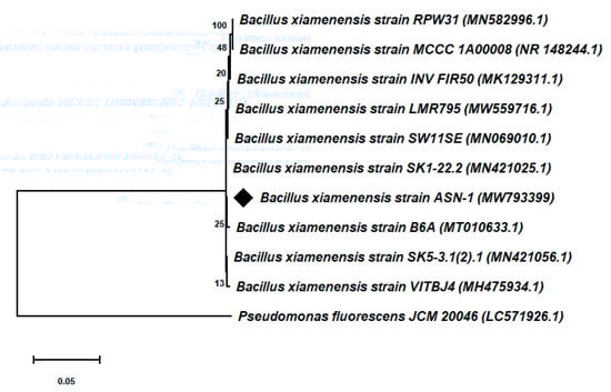 Genomic DNA from the bacterial isolate-1 was extracted by following the method of Sharma et al. [53]. For the amplification of the 16S rRNA gene, a universal 16S rRNA gene-specific primer set, namely, PA (5′-AGA GTT TGA TCC TGG CTC AG-3′) and PH (5′-AAG GAG GTG ATC CAG CCG CA-3′), was used [23]. The amplification was carried out in a total 100 µL reaction mixture comprising a 10X reaction buffer, 2.5 mM dNTPs, 10 pM of each primer, 3 U Taq polymerase, and template DNA (50 ng). The amplification was performed in a thermal cycler (Bio-Rad, Hercules, CA, USA) under the following PCR conditions: initial denaturation at 94 °C for 4 min, followed by 35 cycles of denaturation at 94 °C for 45 s, annealing at 52 °C for 45 s, and elongation at 72 °C for 90 s, with a final extension period of 7 min at 72 °C. The amplified 16S rRNA gene PCR product was purified using a BioFlux PCR purification kit (Bioer Technology Co. Ltd., Hangzhou, China). The purified PCR product was sequenced using the Applied Biosystems (ABI- Prism, Waltham, MA, USA) automated DNA sequencer (Sangon Biotech, Shanghai, China). The obtained 16S rRNA gene sequence of the bacterial strain ASN-1 was aligned using CLUSTAL-W with available 16S rRNA gene sequences of the GenBank database. A neighbor-joining (NJ) phylogenetic tree was created through MEGA-X by evolutionary distance calculations and the Jukes–Cantor coefficient [54,55]. The phylogenetic tree topology was assessed through the bootstrap resampling method with 1000 replicates [56].
