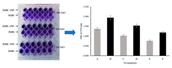 Effect of SNP (100 µM) amendment on PGPR biofilm formation under 5% and 10% NaCl stress. A: PGPR; B: PGPR + SNP; C: PGPR + 5% NaCl; D: PGPR + SNP + 5% NaCl; E: PGPR + 10% NaCl; F: PGPR + SNP + 10% NaCl.
