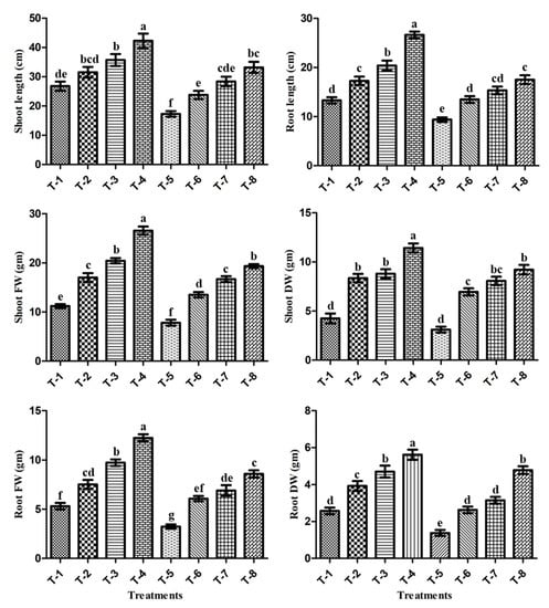 Effect of salt-tolerant PGPR ASN-1 and SNP on sugarcane growth parameters. T-1: Un-inoculated control; T-2: SNP; T-3: PGPR ASN-1; T-4: PGPR ASN-1 + SNP; T-5: NaCl (200 mM); T-6: NaCl + SNP; T-7: NaCl + PGPR ASN-1; T-8: NaCl + PGPR ASN-1 + SNP; FW: fresh weight; DW: dry weight. The mean ± SE, n = 3 is represented. The alphabet letters present on each data bar representing noteworthy variances (p < 0.05) after the DMRT test.