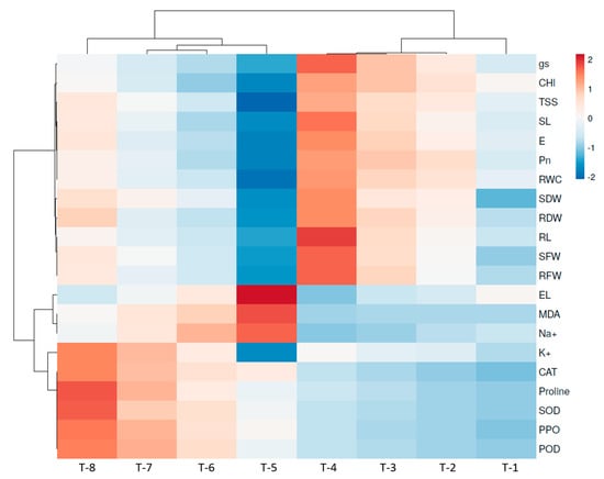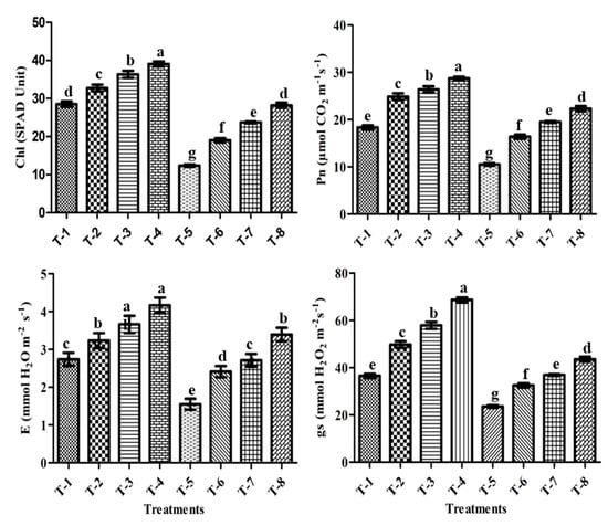 Photosynthetic parameters such as net photosynthetic CO2 assimilation (Pn; µmol CO2 m−2 s−1), transpiration rate (E; mmol H2O m−2 s−1), and stomatal conductance (gs; mmol H2O m−2 s−1) were observed in the third and fourth fully expanded leaves of each plant using a LICOR-6800 portable photosynthesis system (LI-COR Biosciences, Lincoln, NE, USA). The photosynthetic parameter observations of all treatments were taken during the day between 09:00 and 11:00 a.m., using a photosynthetic photon flux density (PPFD) of 1000 µmol m−2 s−1, a CO2 concentration of 400 ppm, and a leaf temperature of 25 ± 2 °C. All the measurements were taken in triplicate.