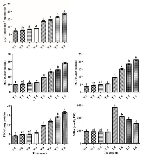 The crude enzyme extract for the estimation of antioxidant enzyme activities was extracted by following the method of Qureshi et al. [63]. In a pre-chilled mortar and pestle, 1.0 g of leaf sample was homogenized with potassium phosphate buffer (100 mM, pH 7.4) comprising 1 mM phenyl-methylsulfonyl fluoride (PMSF), 2% polyvinylpyrrolidone (PVP), and 1 mM EDTA. The mixture was centrifuged for 20 min at 4 °C at 10,000× g, and the supernatant acted as an enzyme extract for catalase (CAT), superoxide dismutase (SOD), polyphenol oxidase (PPO), peroxidase (POD), and malondialdehyde (MDA) estimation.